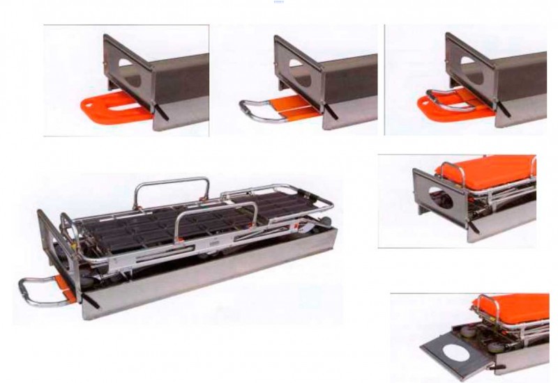 Завантажувальний пристрій призначений для полегшення завантаження та зберігання носилок в автомобілі швидкої допомоги. Пристрій виконаний з нержавіючої сталі високої міцності.
